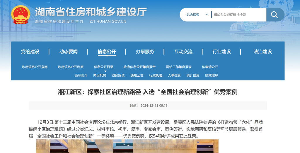 11月30日,第二届全国城乡社区高质量发展论坛暨2024全国城乡社区高质量发展典型案例发布会在人民日报社举行,现场发布了“2024全国城乡社区高质量发展典型案例”名单。本次征集活动共有29个省(自治区、直辖市)申报1200余项案例,案例数量为类似奖项历年之最,竞争异常激烈。湘江新区开发建设局(交通运输局)、岳麓区人民法院申报的《打造物管“六化”品牌 破解小区治理难题》从中脱颖而出,成功入选“2024全国城乡社区高质量发展典型案例”,全省仅四项获奖。